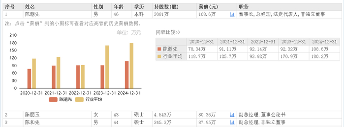 据东方财富网数据,致尚科技董事长兼总经理陈潮先2024年领薪108.6万元,副总陈丽玉、陈和先同年分别领薪80.36万元和87.95万元。