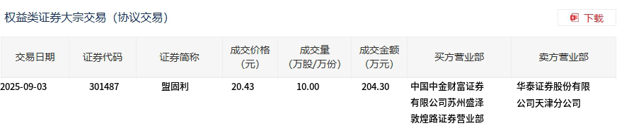 盟固利今日大宗交易折价成交10万股,成交额204.3万元