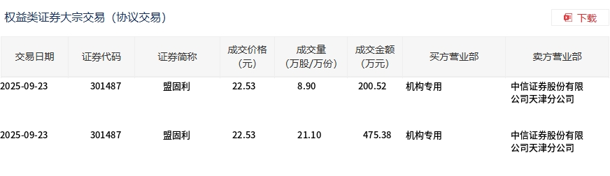 盟固利今日大宗交易折价成交30万股,成交额675.9万元