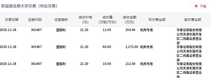 11月28日,盟固利大宗交易成交82万股,成交额1738.4万元,占当日总成交额的7.23%,成交价21.2元,较市场收盘价23.83元折价11.04%。