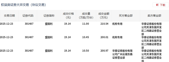 12月23日,盟固利大宗交易成交31.95万股,成交额611.52万元,占当日总成交额的2.23%,成交价19.14元,较市场收盘价21.43元折价10.69%。