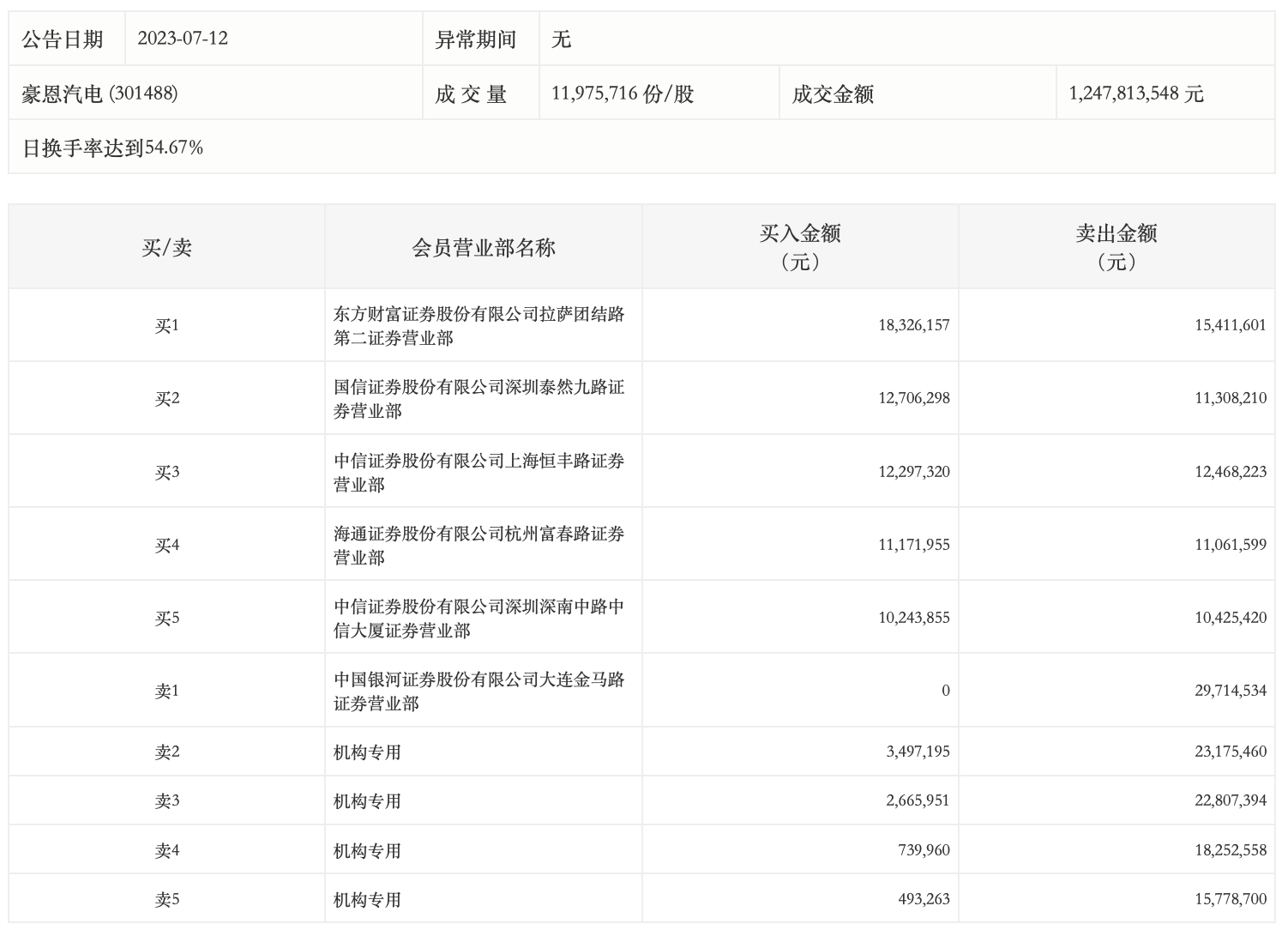 7月12日,豪恩汽电今日跌9.31%,龙虎榜数据显示,上榜营业部席位全天成交2.43亿元,占当日总成交金额比例为19.44%。其中,买入金额为7214.2万元,卖出金额为1.7亿元,合计净卖出9826.17万元。