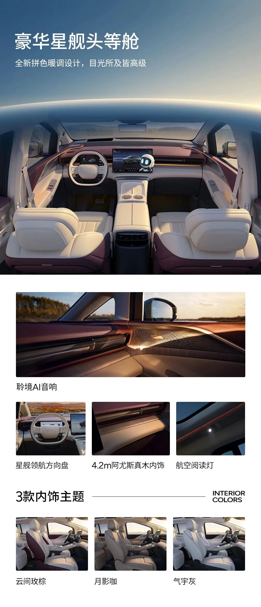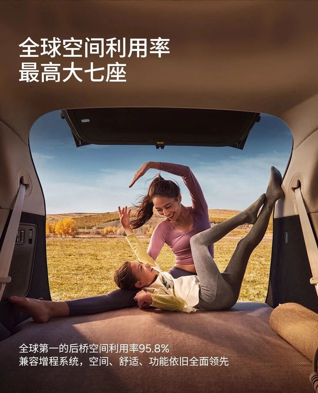 空间与舒适性方面,小鹏X9超级增程版全球首发了“三排电动三折叠”功能,通过“魔变空间 3.0”技术可实现四座、五座、六座和七座多种布局模式,适配不同使用场景;内饰新增“云间玫棕”配色,搭配穹顶星轨氛围灯和 AI 航空阅读灯,打造出“移动星空舱”的优质乘坐体验。