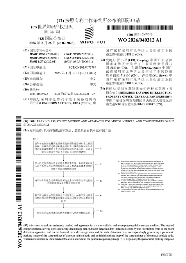 豪恩汽电公布国际专利申请:“机动车辅助泊车方法、装置及计算机可读存储介质”