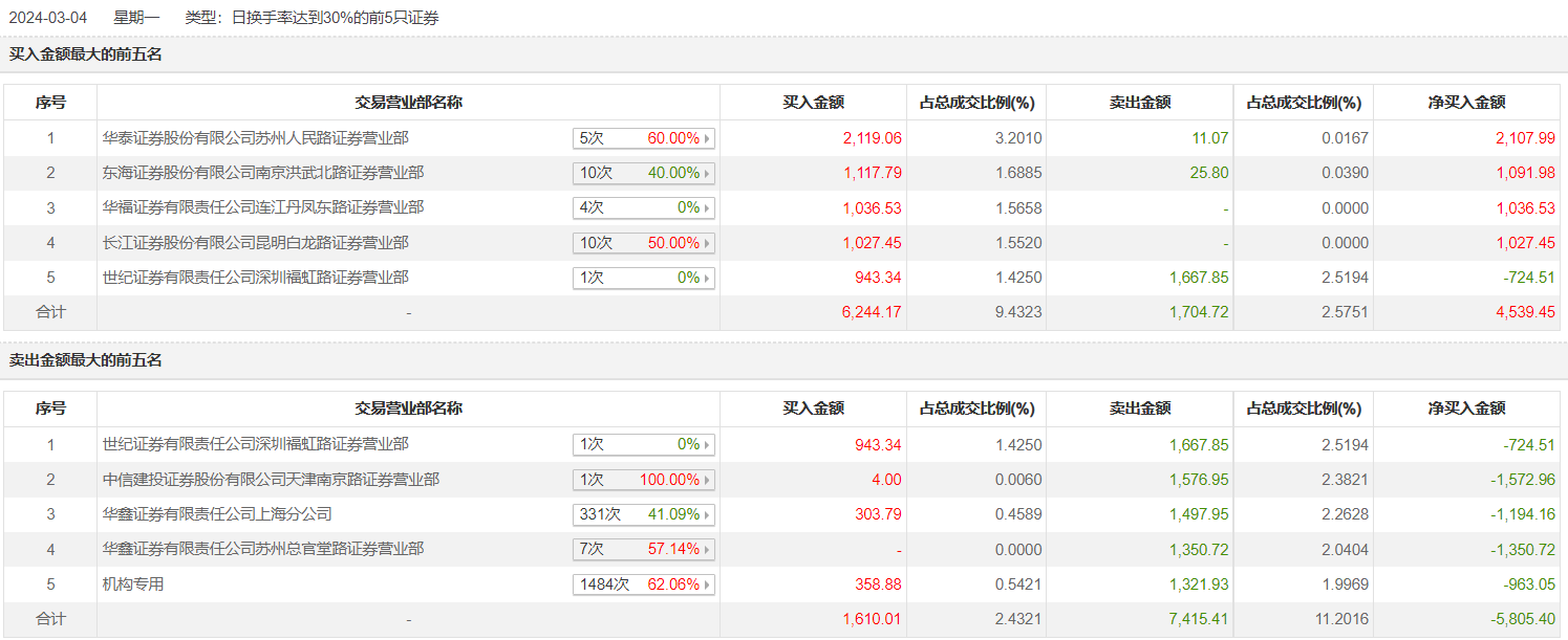具体来看,机构买入358.88万元,卖出1321.93万元,合计净卖出963.05万元。此外,华泰证券苏州人民路证券营业部、东海证券南京洪武北路证券营业部分别买入2119.06万元、1117.79万元;世纪证券深圳福虹路证券营业部、中信建投证券天津南京路证券营业部分别卖出1667.85万元、1576.95万元。