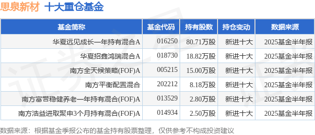根据2025基金半年报公募基金重仓股数据,重仓该股的公募基金共6家,其中持有数量最多的公募基金为华夏基金的华夏远见成长一年持有混合A。华夏远见成长一年持有混合A目前规模为6.22亿元,最新净值1.3603(9月29日),较上一交易日上涨1.05%,近一年上涨92.51%。该公募基金现任基金经理为钟帅。钟帅在任的基金产品包括:华夏行业景气混合,管理时间为2020年7月28日至今,期间收益率为182.73%;华夏招鑫鸿瑞混合A,管理时间为2024年1月16日至今,期间收益率为104.72%;华夏卓越成长混合A,管理时间为2025年8月12日至今,期间收益率为13.16%。