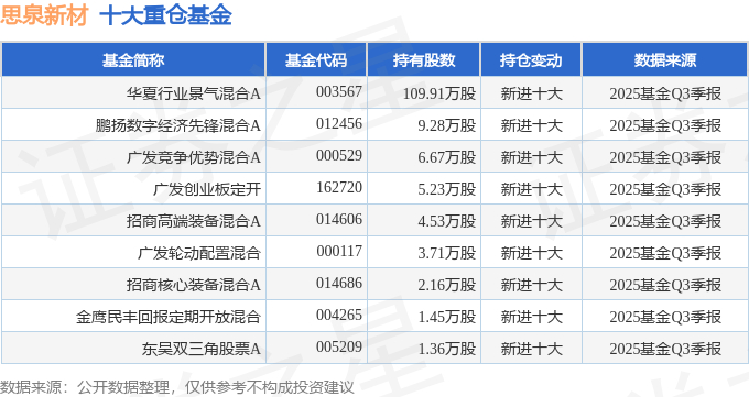 持有思泉新材最多的基金为华夏行业景气混合A,目前规模为89.72亿元,最新净值4.817(10月30日),较上一交易日下跌2.0%,近一年上涨63.23%。该基金现任基金经理为钟帅。