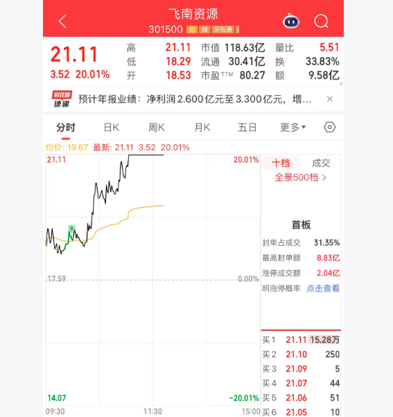 上证报中国证券网讯(记者 李五强)1月28日,飞南资源高开高走,于11时03分封死20%涨停板,报21.11元/股,截至13时11分,成交额达9.58亿元,换手率达33.83%。