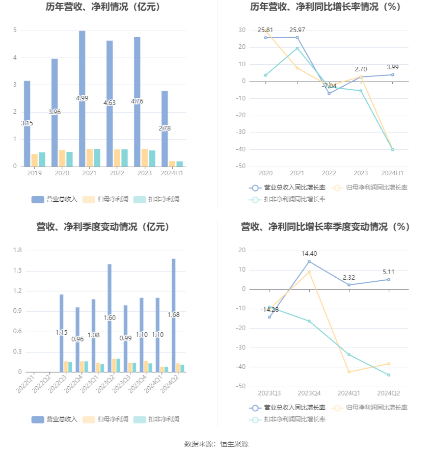 在偿债能力方面,公司2024年上半年末资产负债率为21.49%,相比上年末下降8.92个百分点;有息资产负债率为3.88%,相比上年末下降1.99个百分点。