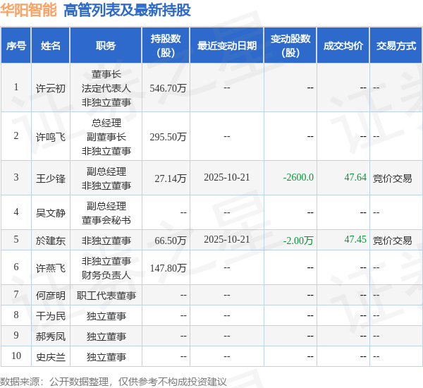 华阳智能:10月31日高管於建东减持股份合计1.08万股