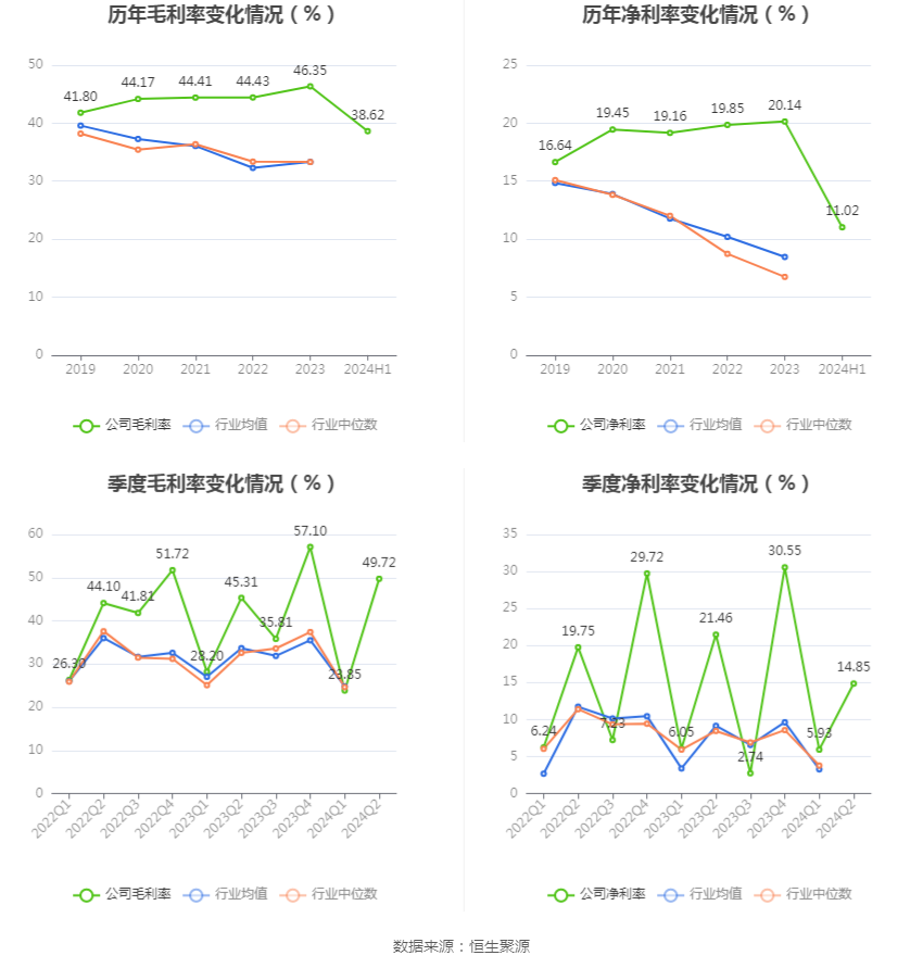 2024年上半年,公司毛利率为38.62%,同比上升0.29个百分点;净利率为11.02%,较上年同期下降4.14个百分点。从单季度指标来看,2024年第二季度公司毛利率为49.72%,同比上升4.41个百分点,环比上升25.87个百分点;净利率为14.85%,较上年同期下降6.61个百分点,较上一季度上升8.92个百分点。