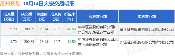 10月14日苏州规划现2笔折价10.5%的大宗交易 合计成交401.78万元