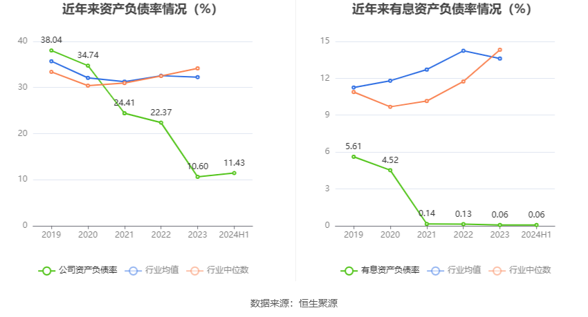 在偿债能力方面,公司2024年上半年末资产负债率为11.43%,相比上年末上升0.83个百分点;有息资产负债率为0.06%,相比上年末基本持平。