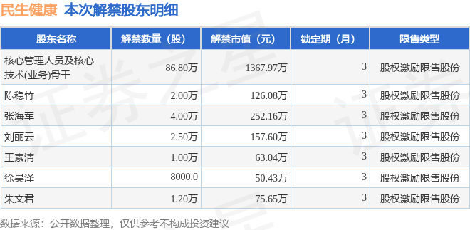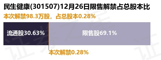民生健康(301507)98.3万股限售股将于12月26日解禁,占总股本0.28%