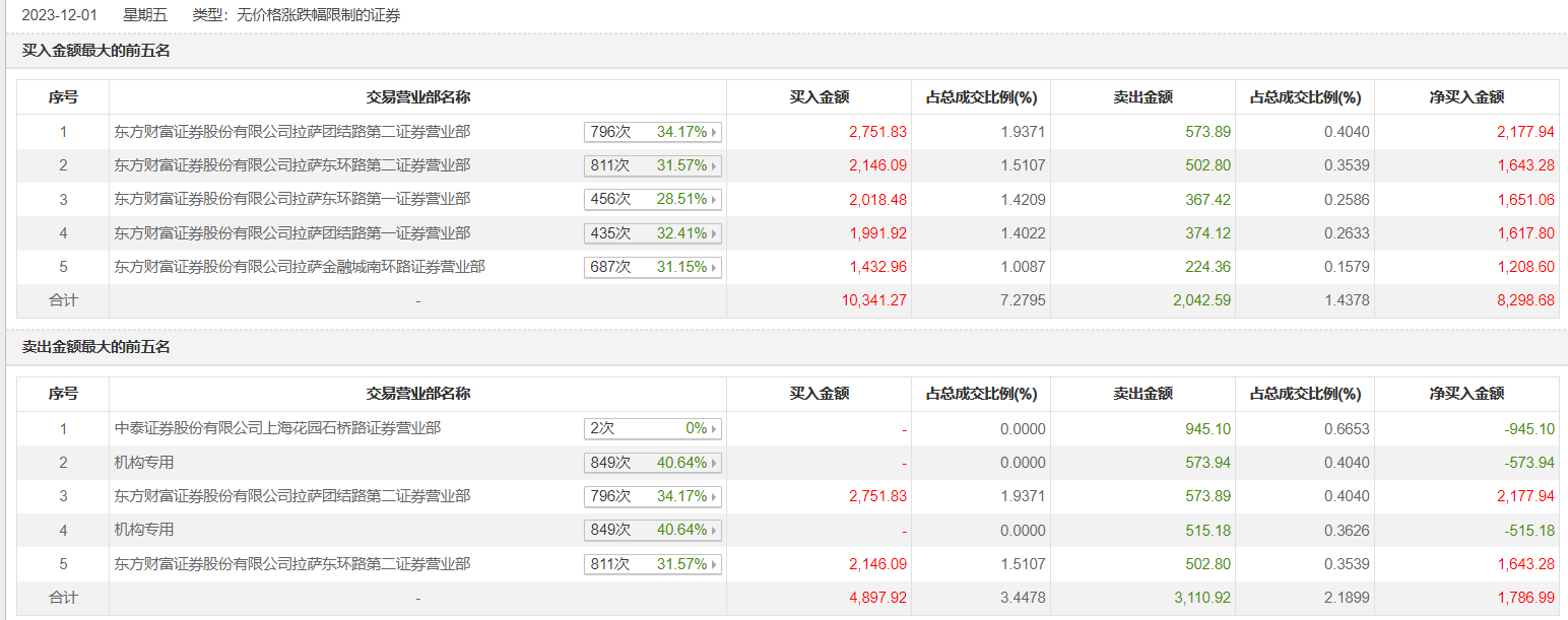 中机认检12月1日涨191.74%,全天换手率达78.88%,振幅达156.42%。龙虎榜数据显示,营业部席位合计净买入6264.45万元。其中,机构合计净卖出1089.12万元。此外,东方财富证券拉萨团结路第二证券营业部、东方财富证券拉萨东环路第二证券营业部分别买入2751.83万元、2146.09万元;中泰证券上海花园石桥路证券营业部、东方财富证券拉萨团结路第二证券营业部分别卖出945.10万元、573.89万元。