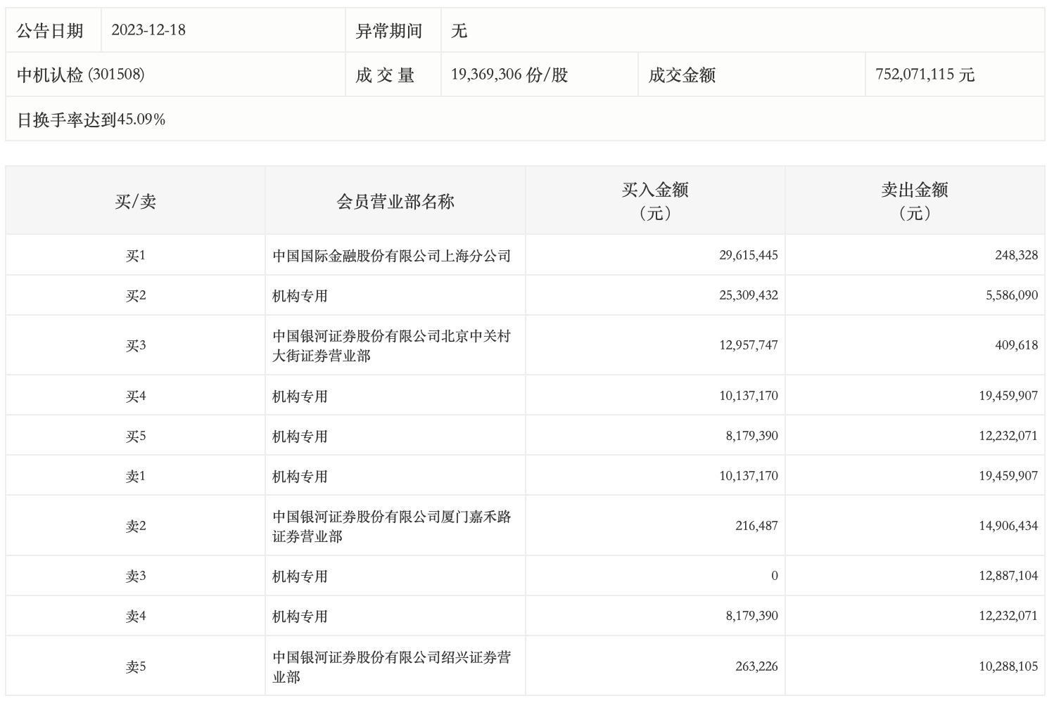 12月18日,中机认检今日跌2.35%,龙虎榜数据显示,上榜营业部席位全天成交1.63亿元,占当日总成交金额比例为21.63%。其中,买入金额为8667.89万元,卖出金额为7601.77万元,合计净买入1066.12万元。