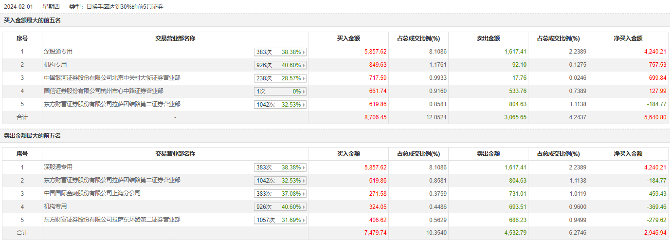 中机认检2月1日跌12.78%,全天换手率达45.12%,振幅达13.34%。龙虎榜数据显示,营业部席位合计净买入4532.3万元。其中,机构买入1173.68万元,卖出785.61万元,合计净买入388.07万元。此外,深股通专用、东方财富证券拉萨团结路第二证券营业部分别卖出1617.41万元、804.63万元;深股通专用、中国银河证券北京中关村大街证券营业部分别买入5857.62万元、717.59万元。
