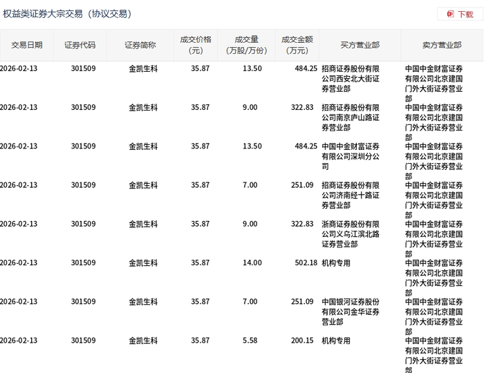 2月13日,金凯生科大宗交易成交78.58万股,成交额2818.67万元,占当日总成交额的10.79%,成交价35.87元,较市场收盘价39.86元折价10.01%。