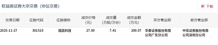 11月27日,固高科技大宗交易成交7.41万股,成交额200.07万元,占当日总成交额的0.93%,成交价27元,较市场收盘价30.2元折价10.6%。