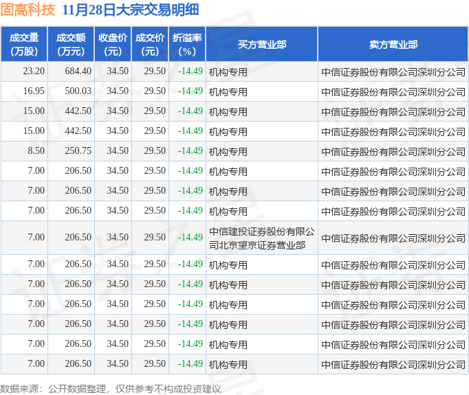 11月28日固高科技现15笔折价14.49%的大宗交易 合计成交4385.18万元