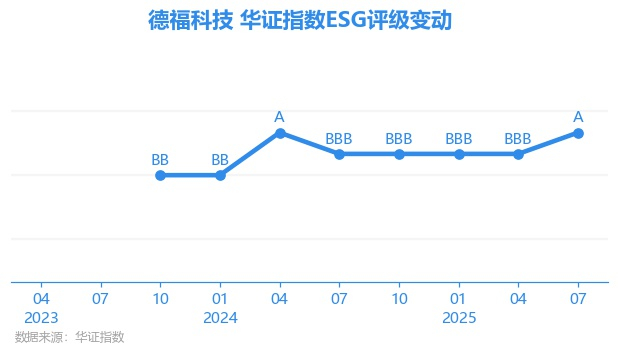 日前,华证指数公布了新一期(2025年7月31日)的ESG评级结果,德福科技(301511.SZ)获得A评级(华证指数评级为C起至AAA九档,C为最低档,AAA为其最高一级评级/AA为其第二档),上一期(2025年4月30日)ESG评级为BBB。本期ESG评级在321家电气设备行业A股上市公司中排名第65(上一期排名第84)。