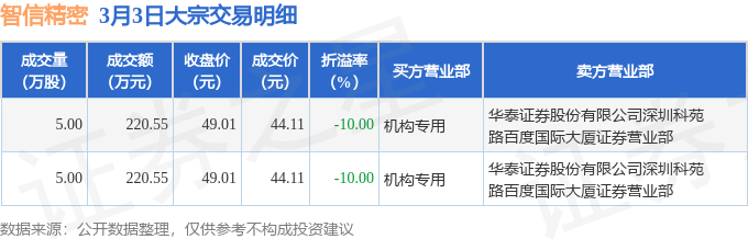 3月3日智信精密现2笔大宗交易 机构净买入441.1万元