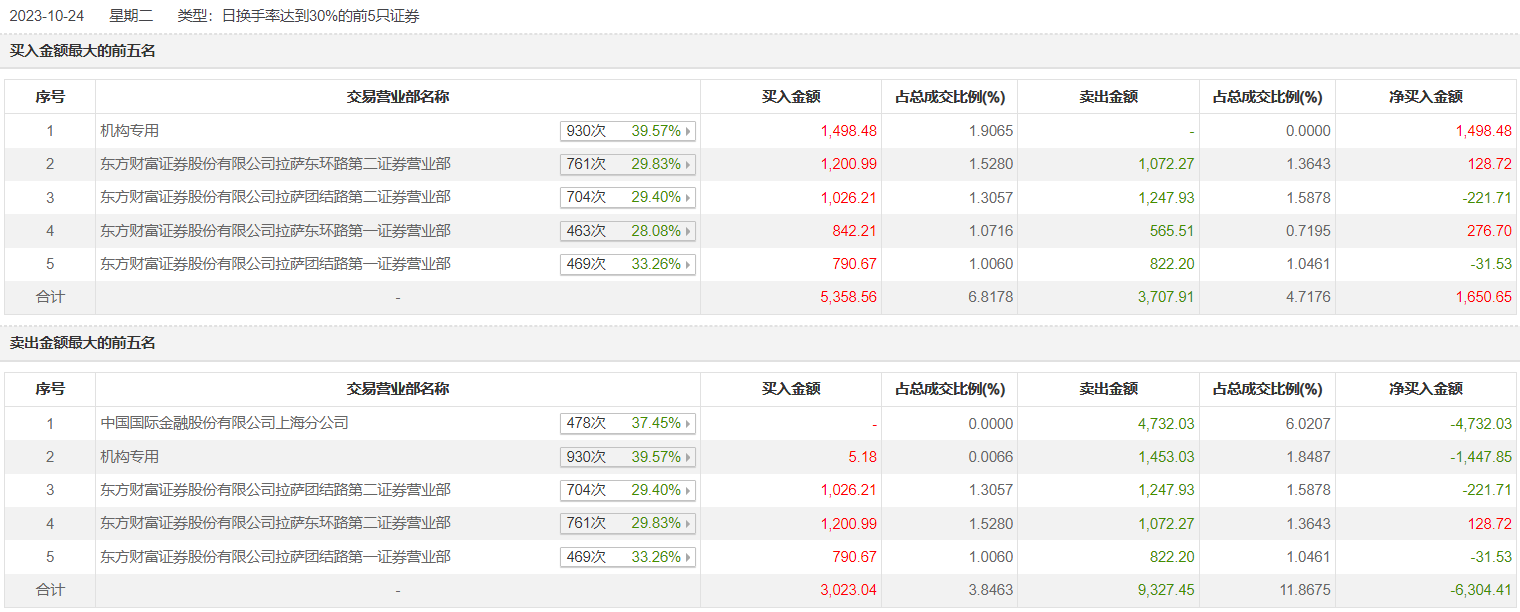 陕西华达10月24日跌13.02%,全天换手率达53.3%,振幅达11.97%。龙虎榜数据显示,营业部席位合计净卖出4529.23万元。其中,机构买入1503.66万元,卖出1453.03万元,合计净买入50.63万元。此外,中国国际金融上海分公司、东方财富证券拉萨团结路第二证券营业部分别卖出4732.03万元、1247.93万元;东方财富证券拉萨东环路第二证券营业部、东方财富证券拉萨团结路第二证券营业部分别买入1200.99万元、1026.21万元。