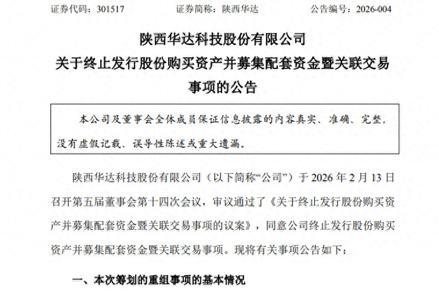 2月13日晚,陕西华达(301517)发布公告称,决定终止发行股份购买陕西华经微电子股份有限公司(以下简称“华经微电子”)100%股份并募集配套资金事项。