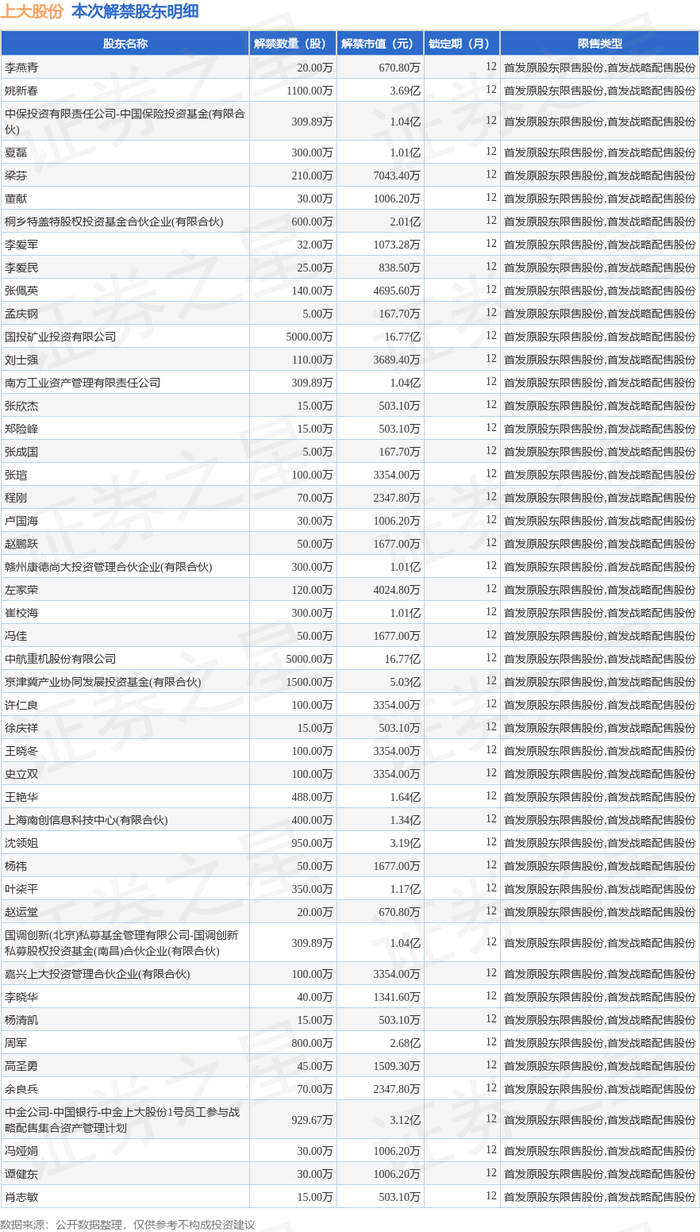 证券之星消息,根据市场公开信息整理,上大股份(301522)于10月16日将有2.07亿股限售股份解禁,为公司首发原股东限售股份,首发战略配售股份,占公司总股本55.68%。(本次数据根据历史公告整理得出,实际情况以上市公司最新公告为准)最近一年内,该股累计解禁372.28万股,占总股本的1.0%。本次解禁后,公司还有9045.0万股限售股份,占总股本24.32%。具体如下图所示: