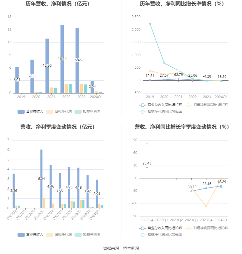2024年第一季度,公司经营活动现金流净额为6581.09万元,同比增加8927.39万元;筹资活动现金流净额-420.98万元,同比减少3317.04万元;投资活动现金流净额-2614.01万元,上年同期为-1249.63万元。