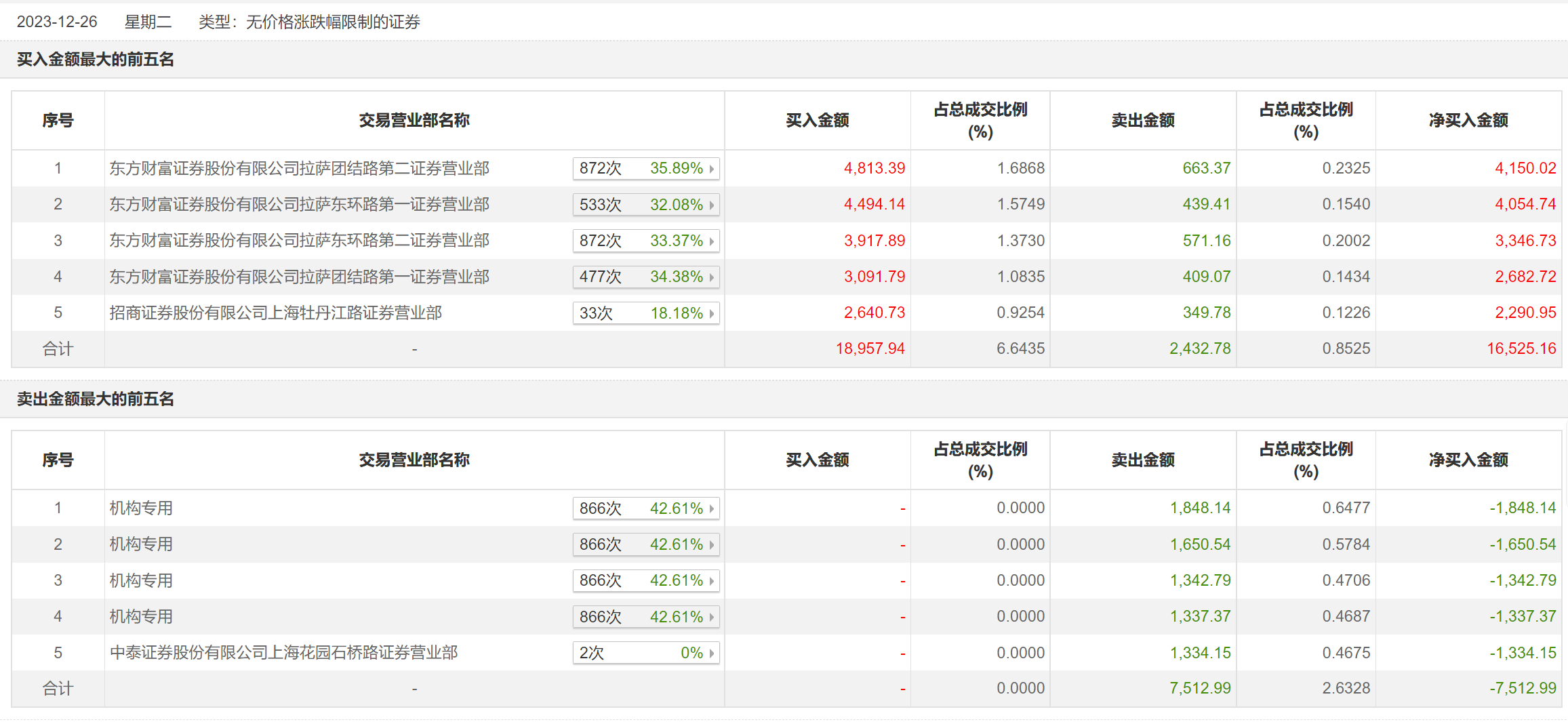 12月26日,C国际复今日涨148.87%,全天换手率达71.62%,振幅达65.79%。龙虎榜数据显示,营业部席位合计净买入9012.16万元。其中,机构合计净卖出6178.84万元。此外,东方财富证券拉萨团结路第二证券营业部、东方财富证券拉萨东环路第一证券营业部分别买入4813.39万元、4494.14万元;中泰证券上海花园石桥路证券营业部、东方财富证券拉萨团结路第二证券营业部分别卖出1334.15万元、663.37万元。