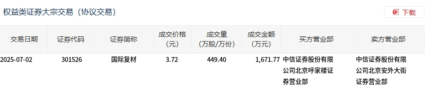 国际复材今日大宗交易折价成交449.4万股,成交额1671.77万元