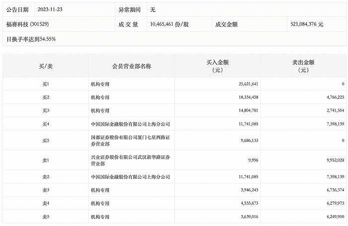 11月23日,福赛科技今日涨11.63%,全天换手率达54.55%,振幅达18.03%。龙虎榜数据显示,营业部席位合计净买入4819.49万元。其中,机构买入7088.18万元,卖出2677.4万元,合计净买入4410.78万元。此外,中国国际金融上海分公司、国都证券厦门七星西路证券营业部分别买入1174.11万元、968.61万元;兴业证券武汉新华路证券营业部、中国国际金融上海分公司分别卖出995.20万元、739.81万元。