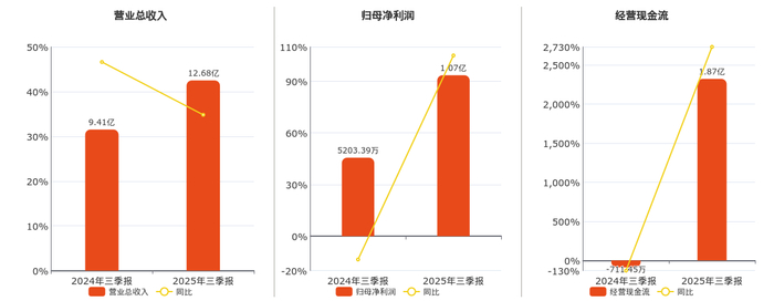 公司营业总收入为12.68亿元。归母净利润为1.07亿元。经营活动现金净流入为1.87亿元。