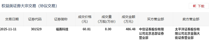 11月11日,福赛科技大宗交易成交8万股,成交额486.48万元,占当日总成交额的5.18%,成交价60.81元,较市场收盘价61.42元折价0.99%。