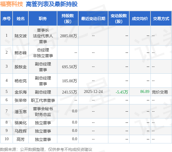 福赛科技近半年内的董监高及核心技术人员增减持详情如下: