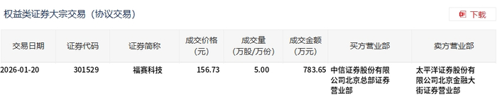 1月20日,福赛科技大宗交易成交5万股,成交额783.65万元,占当日总成交额的1.27%,成交价156.73元,较市场收盘价158.31元折价1%。