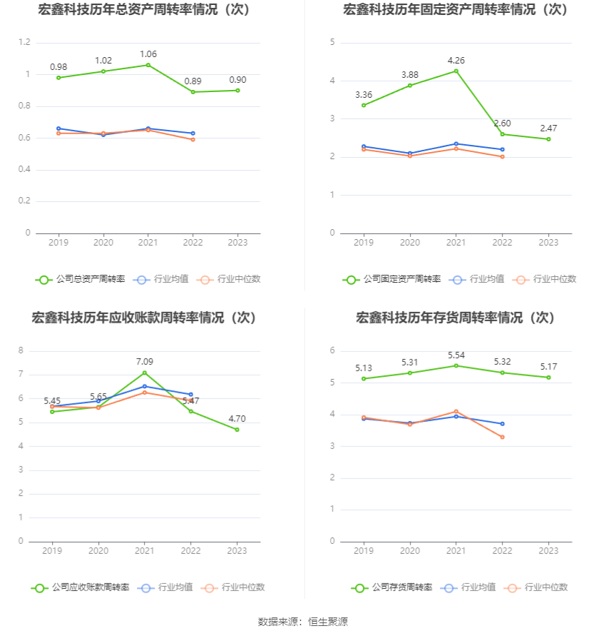 营运能力方面,2023年,公司公司总资产周转率为0.90次,上年同期为0.89次(2022年行业平均值为0.63次,公司位居同行业5/20);固定资产周转率为2.47次,上年同期为2.60次(2022年行业平均值为2.20次,公司位居同行业8/20);公司应收账款周转率、存货周转率分别为4.70次、5.17次。