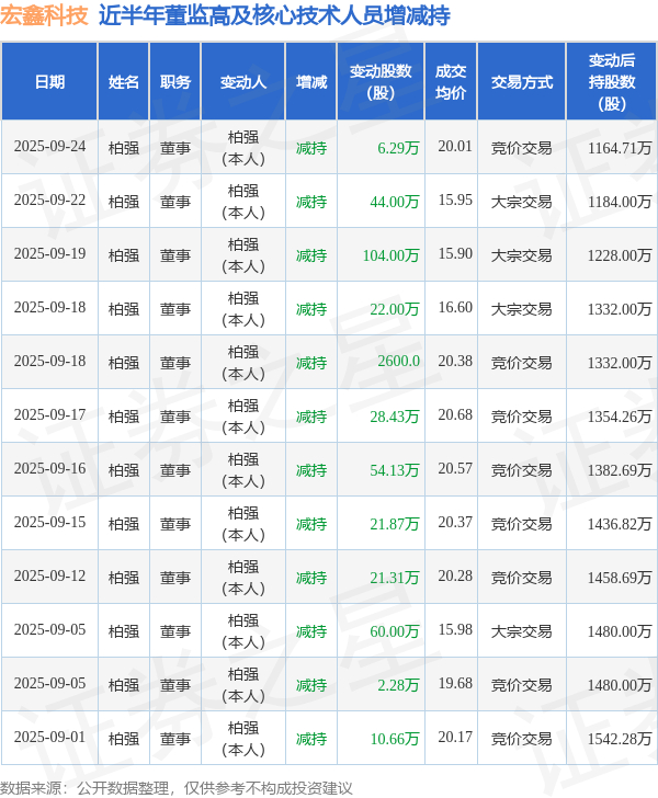 宏鑫科技:9月24日高管柏强减持股份合计6.29万股