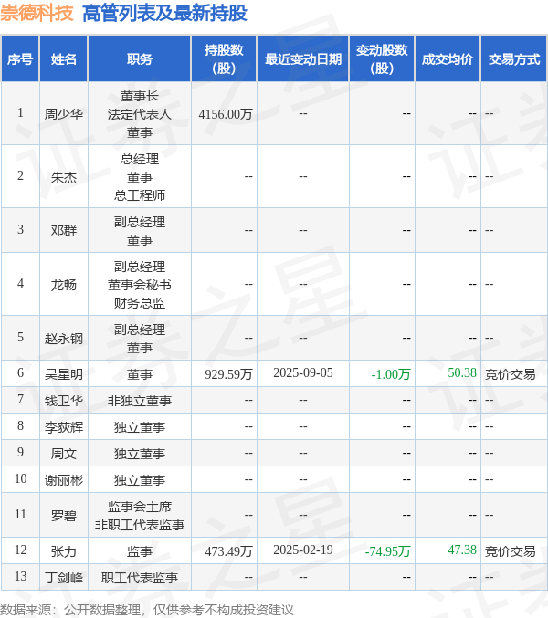 崇德科技的高管列表及最新持股情况如下: