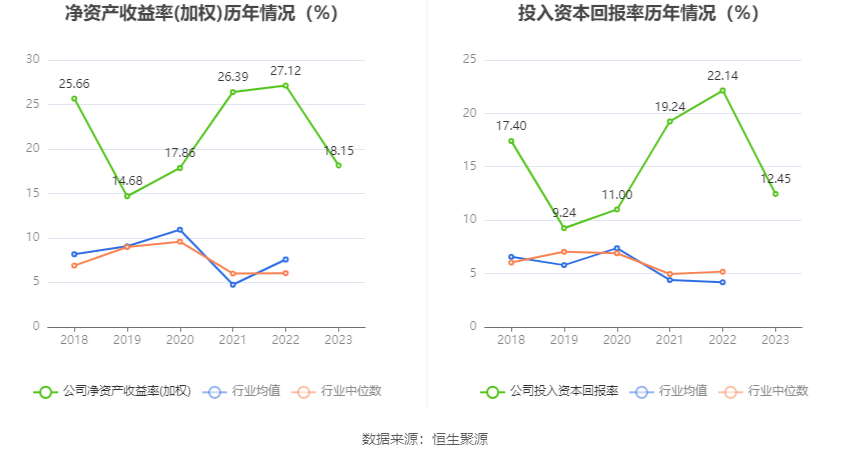 数据显示,2023年公司加权平均净资产收益率为18.15%,较上年同期下降8.97个百分点;公司2023年投入资本回报率为12.45%,较上年同期下降9.69个百分点。