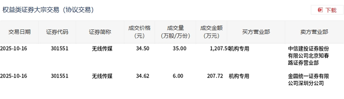 10月16日,无线传媒大宗交易成交41万股,成交额1415.22万元,占当日总成交额的8.41%,成交均价34.52元,较市场收盘价34.85元折价0.95%,其中最高成交价34.62元,最低成交价34.5元。