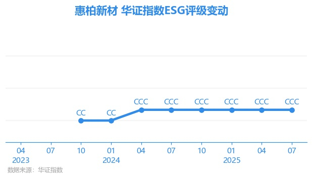 日前,华证指数公布了新一期(2025年7月31日)的ESG评级结果,惠柏新材(301555.SZ)获得CCC评级(华证指数评级为C起至AAA九档,C为最低档,AAA为其最高一级评级/AA为其第二档),上一期(2025年4月30日)ESG评级为CCC。本期ESG评级在462家化学制品行业A股上市公司中排名第385(上一期排名第390)。