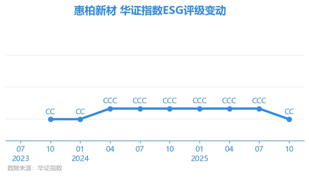 日前,华证指数公布了新一期(2025年10月31日)的ESG评级结果,惠柏新材(301555.SZ)获得CC评级(华证指数评级为C起至AAA九档,C为最低档,AAA为其最高一级评级/AA为其第二档),上一期(2025年7月31日)ESG评级为CCC。本期ESG评级在494家化学制品行业A股上市公司中排名第414(上一期排名第385)。