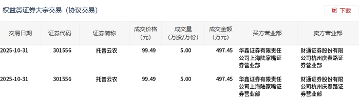10月31日,托普云农大宗交易成交10万股,成交额994.9万元,占当日总成交额的3.79%,成交价99.49元,较市场收盘价100.9元折价1.4%。