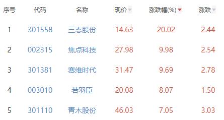其中,三态股份、焦点科技、赛维时代、若羽臣、青木股份位列板块涨幅前五位,涨幅分别为20.02%、9.98%、9.69%、8.07%、7.05%。