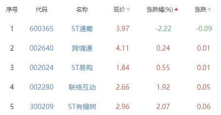 ST通葡、跨境通、ST易购、联络互动、ST有棵树位列涨幅榜后五位,涨幅分别为-2.22%、0.24%、0.55%、1.92%、2.07%。