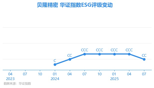 日前,华证指数公布了新一期(2025年7月31日)的ESG评级结果,贝隆精密(301567.SZ)获得CC评级(华证指数评级为C起至AAA九档,C为最低档,AAA为其最高一级评级/AA为其第二档),上一期(2025年4月30日)ESG评级为CCC。本期ESG评级在147家家庭耐用消费品行业A股上市公司中排名第118(上一期排名第113)。