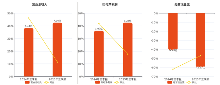 公司营业总收入为7.16亿元。归母净利润为1.26亿元。经营活动现金净流入为-2.13亿元,在已披露的同业公司中排名第30,较去年同报告期经营活动现金净流入减少6809.56万元。