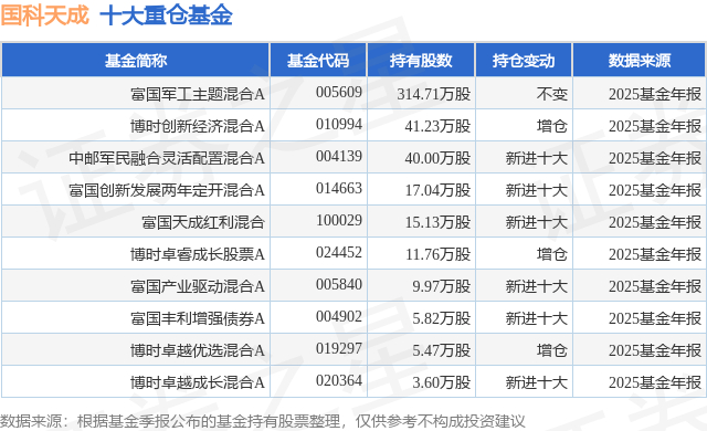 重仓国科天成的前十大公募基金请见下表:
